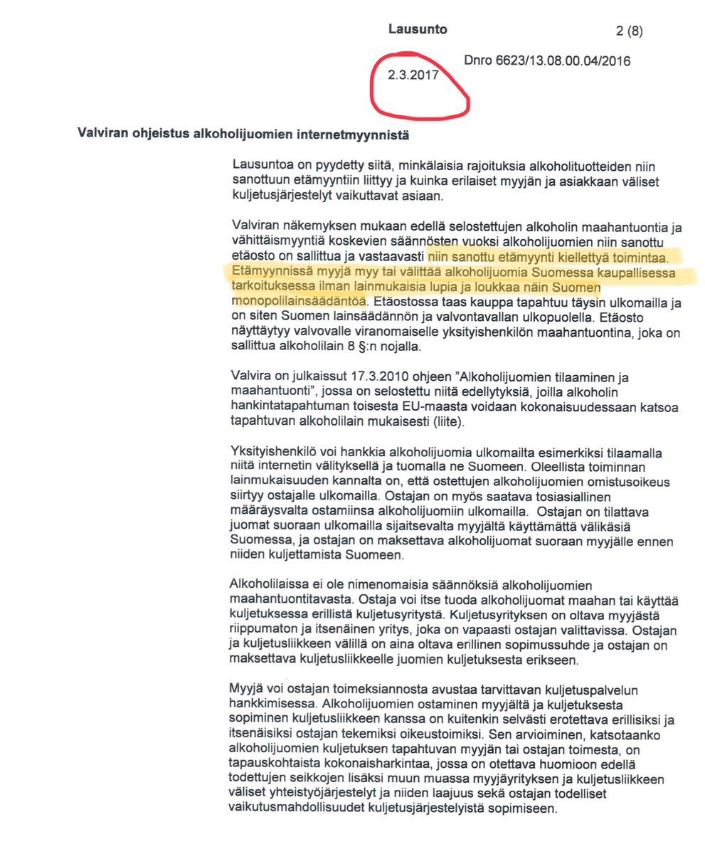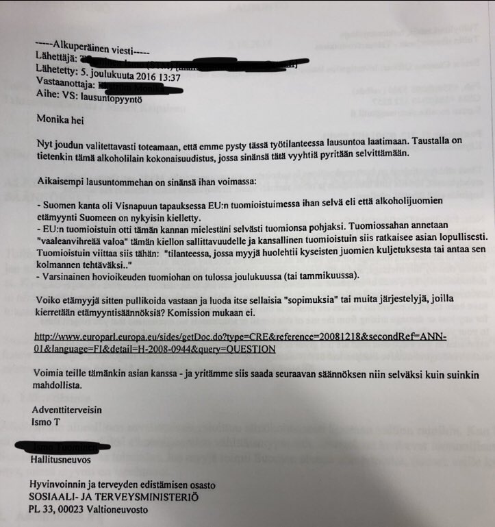 Myös @STM_Uutiset lausui Vironviinaa-tapauksen esitutkinnassa 5.12.2016 ja vahvisti, että Suomen mukaan #etämyynti on kielletty. Toisin kuin @ValviraAlkoholi’n lausunto, STM ei lausunut notifioinnin odotusaikana, vaan sitä ennen.