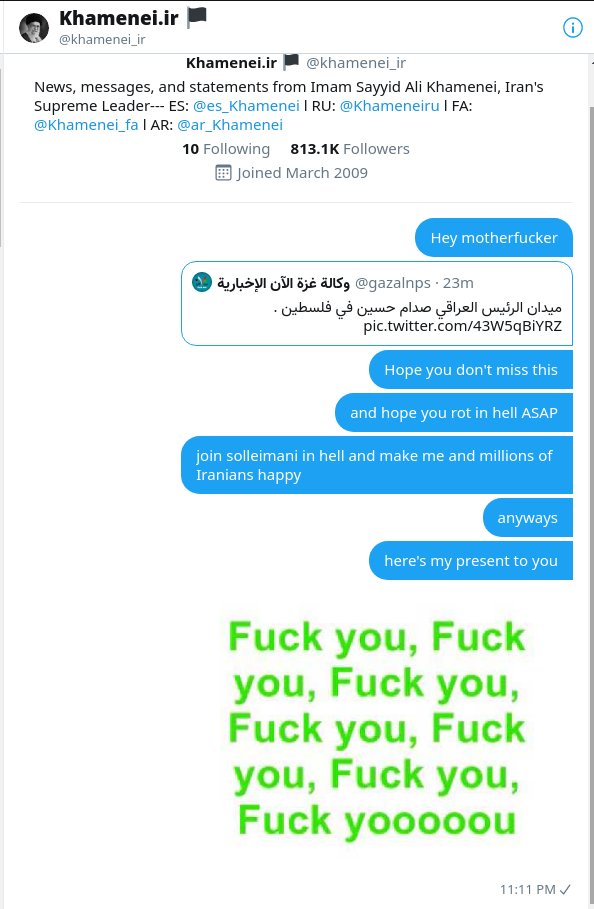 Thank you @ConservaCrenson for letting me know that I actually CAN DM the supreme bastard, Khamenei, here's what I sent that dirtbag Image