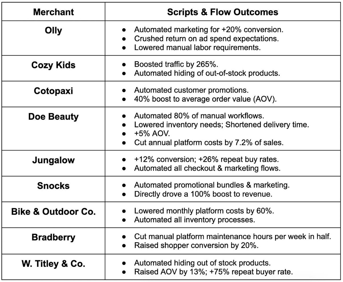 Shopify Flow, which was exclusive to Plus merchants until late last year, is a tool to seamlessly automate Scripts creation. Put simply, while Scripts is a tool to “build incremental back-end custom logic,” Flow is a close complement that frequently pulls from this logic to automate the workflows that it innately creates. All customizations are easily deployed (in a no-code manner) to stores via Metafields.