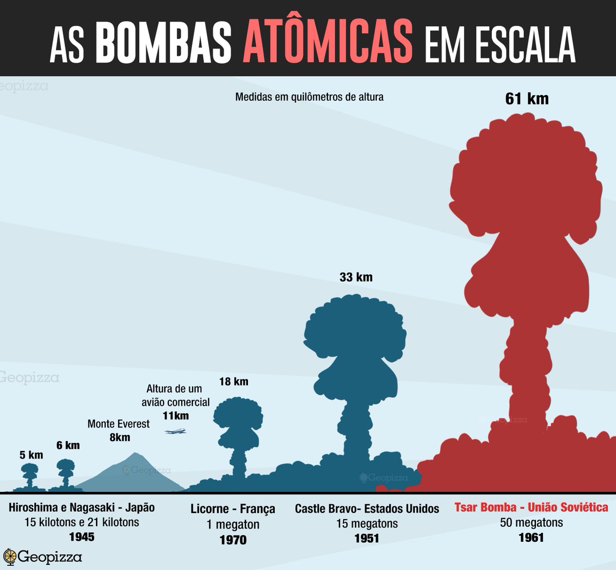 A bomba atômica soviética chamada Ivan possuía 27 toneladas e foi detonada a 4km do solo, produzindo 50 megatons, um poder equivalente a 3.800 bombas de Hiroshima.