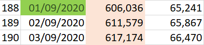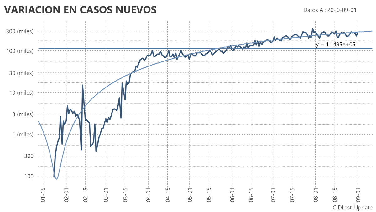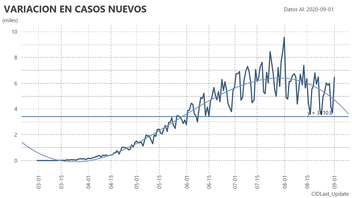El porcentaje de aumento de casos contra el día anterior fue del 0.6%. Se llega a 600 mil casos hoy, se llegará a 700 mil el para el día 17 de septiembre.