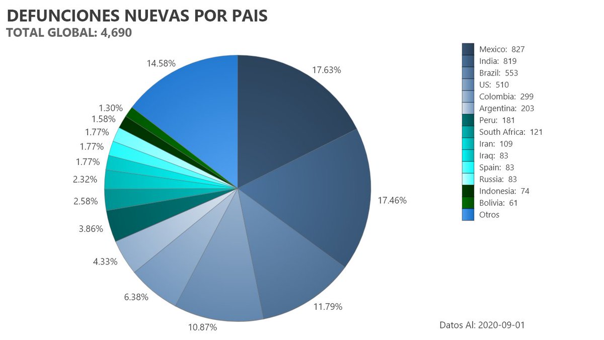 En defunciones nuevas México está en primer lugar de la métrica y contribuye con el 17.63% del total de muertos mundial para el día de hoy.