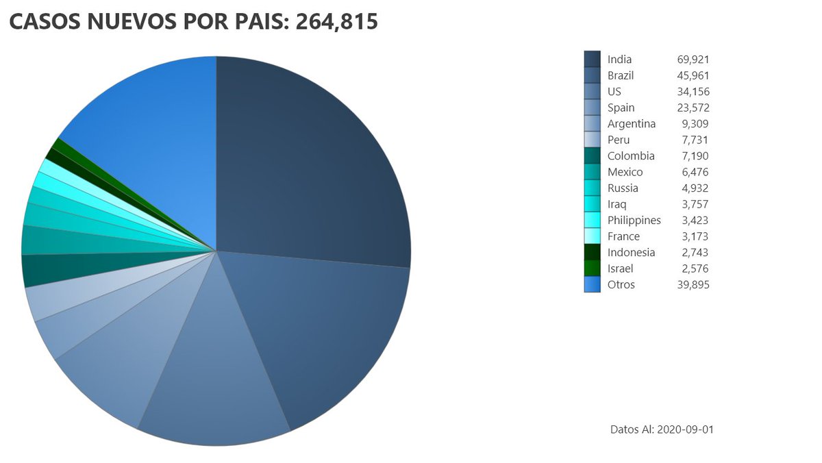 El país con mas casos nuevos es India con 69 mil seguido de Brasil, USA y España. México está en el octavo lugar de la métrica.