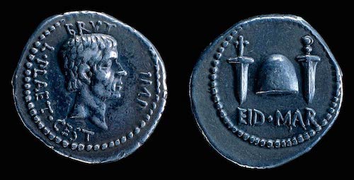 Milattan önce 44 yılında Julius Caesar'ın öldürülmesinin ardından ona ihanet eden Brütüs doğrudan halka hitap etmek için kendi paralarını bastırdı Bu paralar bir yüzünde kendi portresi, diğer yüzünde Pileus şapkası (kurtuluş ile ilişkili bir örtü) ile birlikte iki hançere sahipti