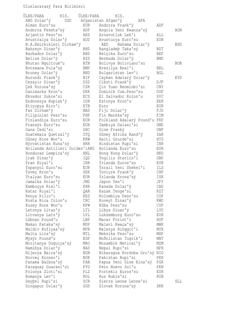 Her para biriminin kısaltma adları vardır. İlk iki harf ülkeyi, üçüncü harf ise para birimi adını tanımlar.