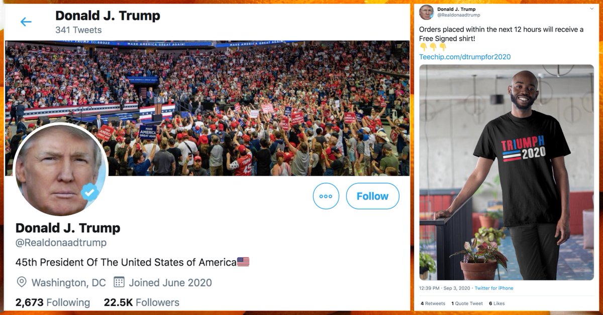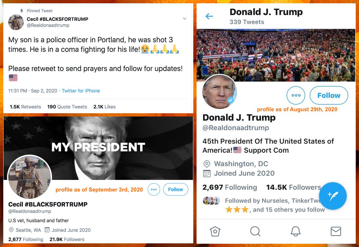 Update: @ReaIdonaadtrump has now deleted all the tweets claiming to have a police officer son who was shot in Portland, discarded the "BLACKS FOR TRUMP" persona, and has returned to its previous mission of impersonating Trump. Also, it appears to be selling T-shirts.