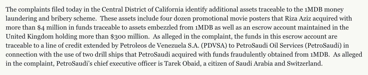 The DOJ is looking to forfeit another $300 Million in assets traceable to the #1MDB scandal, including 4 dozen promotional movie posters worth $4 million from Riza Aziz and $300 million being held in a UK escrow account.