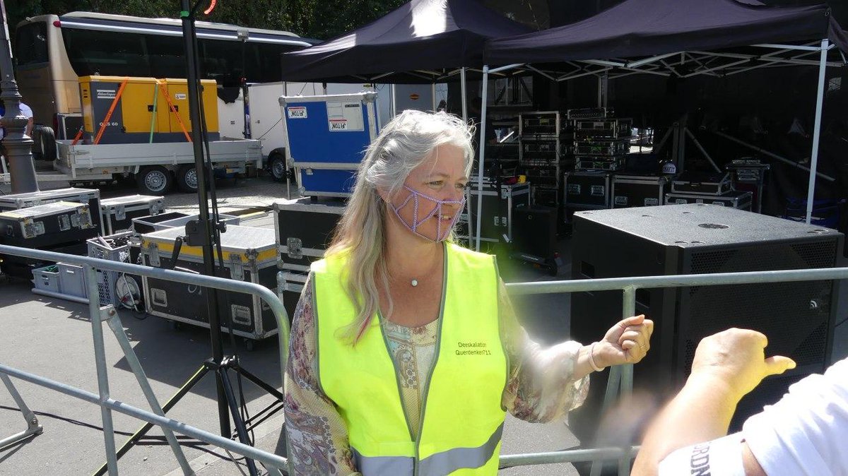 Eine Mitarbeiterin des Teams "Deeskalation" von #Querdenken711 in Berlin.
