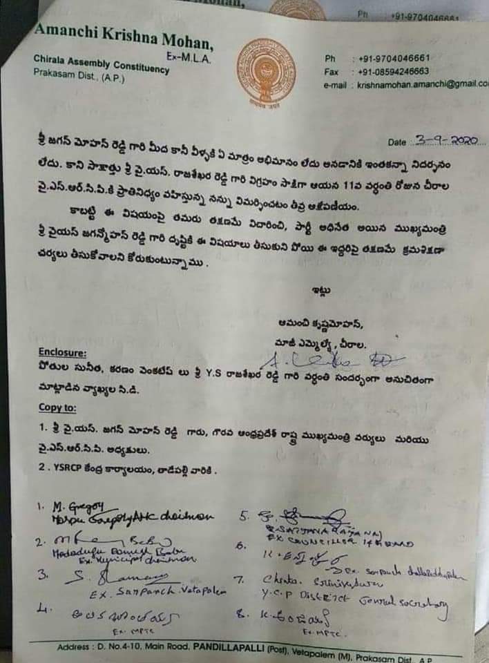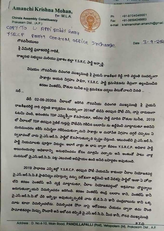 *చీరాలలో వైయస్ వర్ధంతి నివాళి సందర్భంగా పార్టీ నియోజకవర్గ ఇంచార్జ్ గా ఉన్న తనపై కరణం వెంకటేష్, పోతుల సునీతలు అబ్యంతర కర వ్యాఖ్యలు చేశారంటూ ఫిర్యాదులో పేర్కొన్న ఆమంచి.