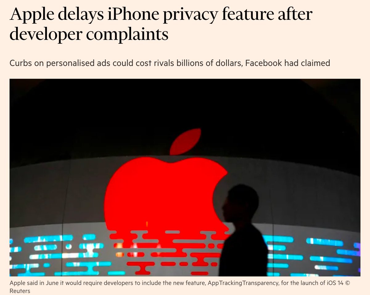 Today @Apple delayed its new privacy feature because of complaints from the companies that are exploiting your data for ads and other purposes. The idea that you should give explicit permission will have to wait a bit longer. ft.com/content/da9247…