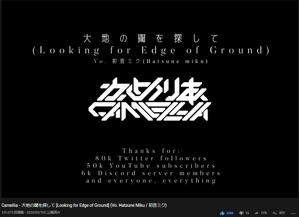 and 80k song also had exceeded 100k plays! this is genuinely amazing, thank you for your support as always! ツイッターフォロワー8万人の記念曲も10万再生を記録!感謝! Camellia - 大地の閾を探して [Looking for Edge of Ground] (Vo. Hatsune Miku / 初音ミク)
