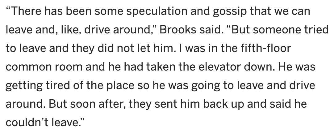 UA freshman Cody Brooks said the person posted at the entrance to Burke West, the UA COVID-19 isolation dorm where he is currently living, is tasked with stopping students from leaving. Image