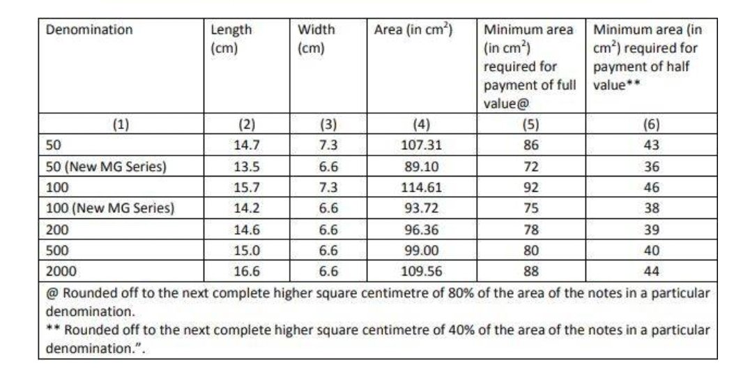 நீங்க ஒரு கிழிஞ்ச 500ரூவாயோட போறீங்க. அந்த நோட்டு மூணு துண்டா கிழிஞ்சுடுச்சு. ஏதாவது ஒரு துண்டு 80 சதுர செமீ இருந்தா மட்டுமே முழுசா கிடைக்கும். 40 - 79 சதுர செமீ இருந்தா பாதி கிடைக்கும். 40க்கு கீழ இருந்தா மாமா பிஸ்கோத்து தான்.