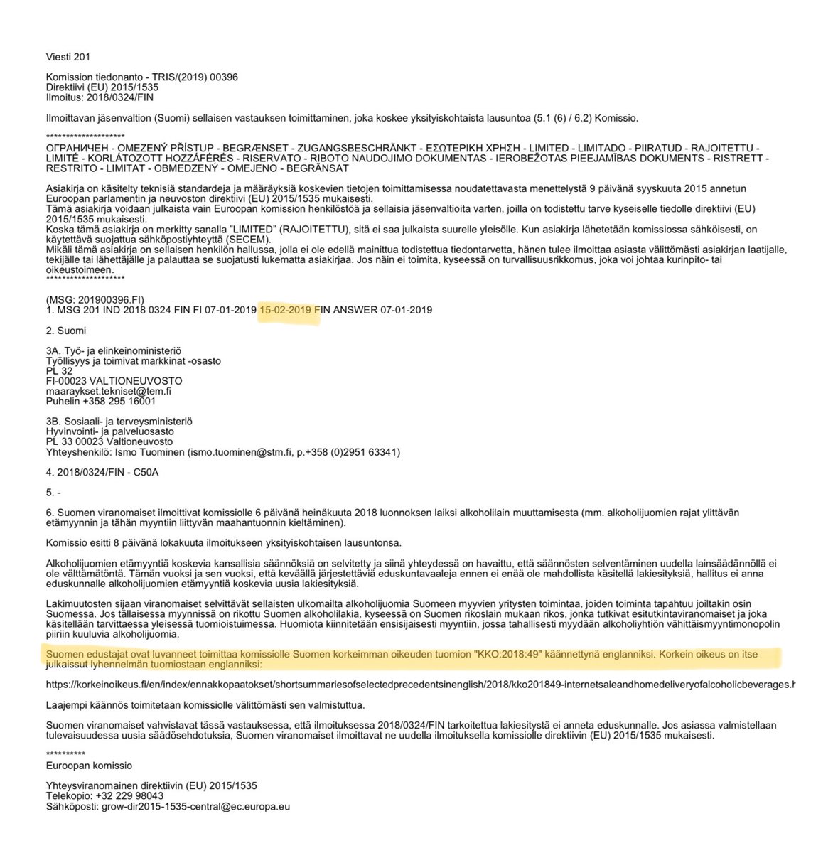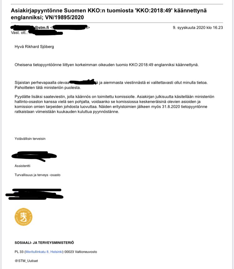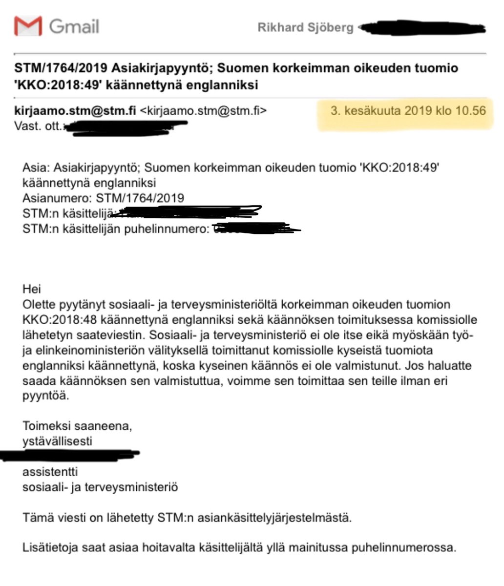 Päivän #etämyynti-pähkinä: mikä KKO:n tuomion kääntämisessä kestää? Alkotaxi-tuomio tuli yli 2v sitten eikä STM ole lähettänyt komissiolle käännöstä.
