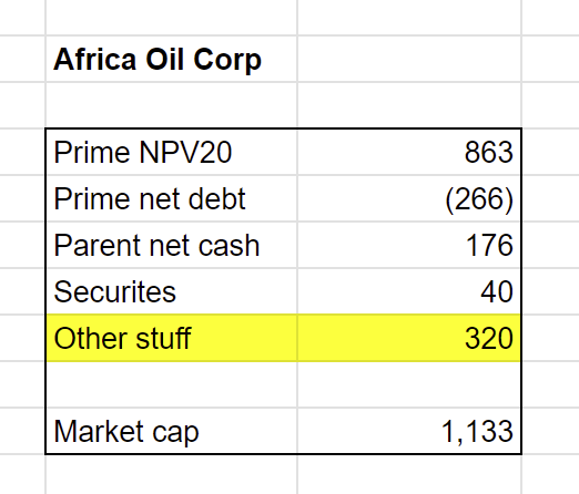Here are the net oil and gas reserves of its Prime joint venture, at a conservative price deck in the mid-70s. Shall we apply a 20% discount rate for Nigeria? Let's ignore the fact that the tax rate dropped from 50% to 30% after the reserve statement, greatly boosting NPV.