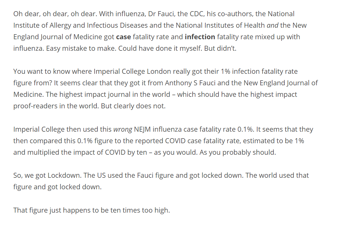 drmalcolmkendrick.org/2020/09/04/cov… says that Imperial College model, which panicked everyone, relied on Fauci's erroneous IFR (as opposed to CFR) of 1%. Even worse than we thought.