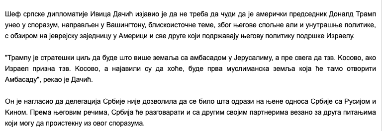Serbian Foreign Minister Ivica Dačić says will "not allow anything to affect Serbia's relations with #Russia and #China," issues arising from agreement will be discussed, Trump's strategic goal is to get as many embassies to #Jerusalem as possible given Jewish/Evangelical support