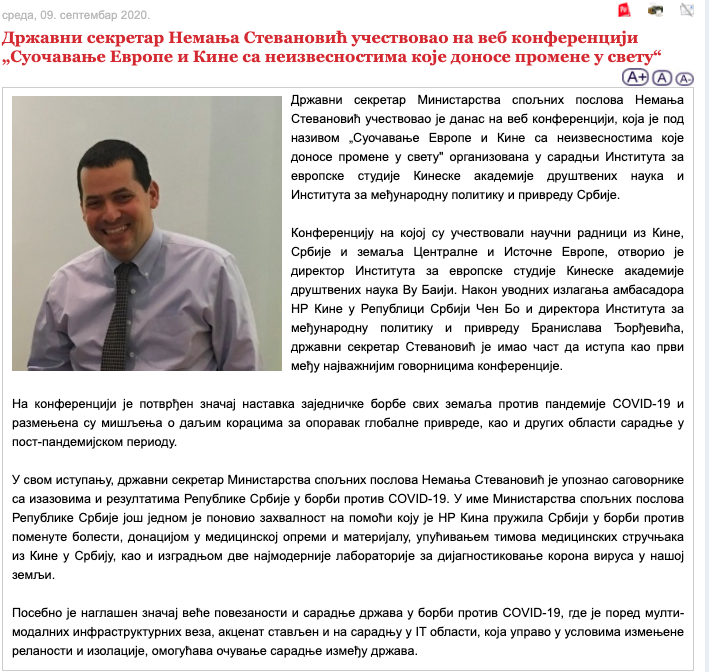State Secretary of #Serbia's Ministry of Foreign Affairs Nemanja Stevanović partakes in conference organised by Chinese Academy of Social Sciences with #CCP ambassador & scientists from China, Serbia, Central/Eastern Europe.