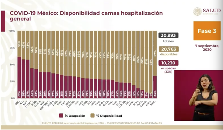 #ConferenciaCovid | A la fecha, existen un total de 30, 993 camas para atención general, de las cuales 20, 763 están disponibles y el 33% están ocupadas. Las entidades que reportan mayor ocupación de camas para atención general son: #Colima (61%) #NL (58%) #Nayarit (57%)