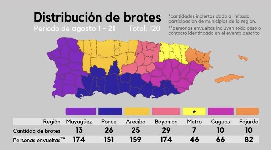 Del 1 al 21 de agosto registró 120 brotes de #COVID19 en #PuertoRico. 57% de estos brotes fueron de origen familiar (fiestas y reuniones, cumpleaños, velorios, etc).