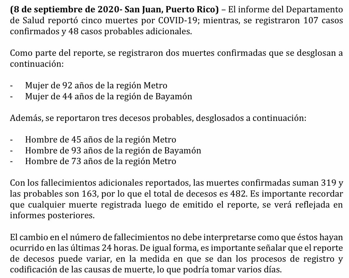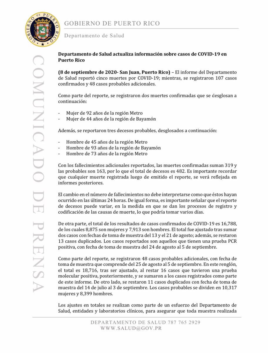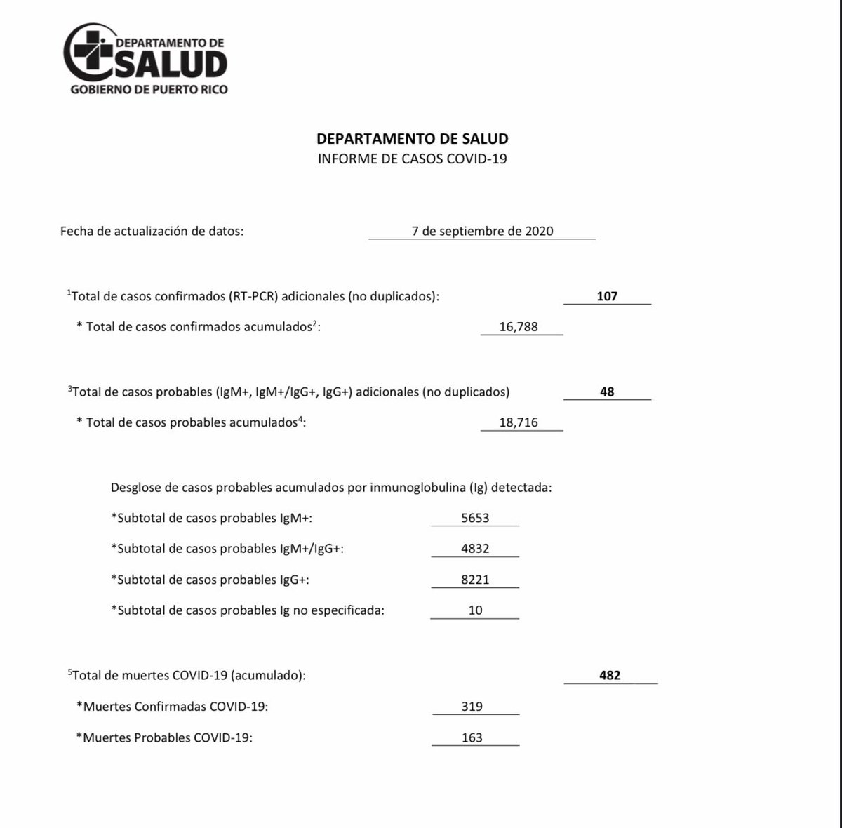 1.) 107 casos CONFIRMADOS adicionales de #COVID19 registrados hoy por @DeptSaludPR. Muestras del 24 de agosto al 5 de septiembre (-13 casos duplicados).