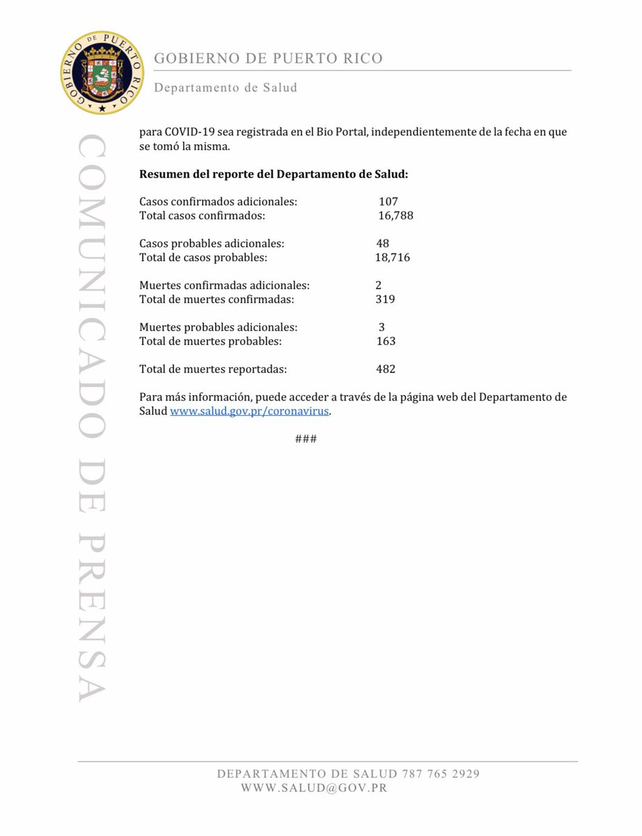(20/octubre) La muerte confirmada por #COVID19 reportada en el informe de hoy, ocurrió el 18 de octubre. Corresponde a una mujer de 61 años, de la región de Bayamón. #PuertoRico