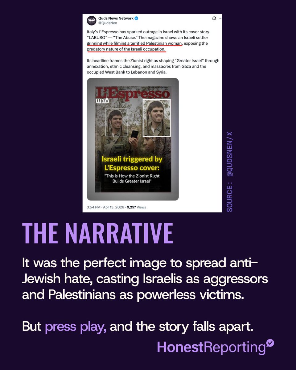 Italian magazine @espressonline put a photo of a Jewish IDF soldier and a Palestinian woman on its cover under the headline “The Abuse.” It played on all of the emotional tropes: an abusive man vs. the abused woman; the heartless Israeli monster vs. the powerless Palestinian.