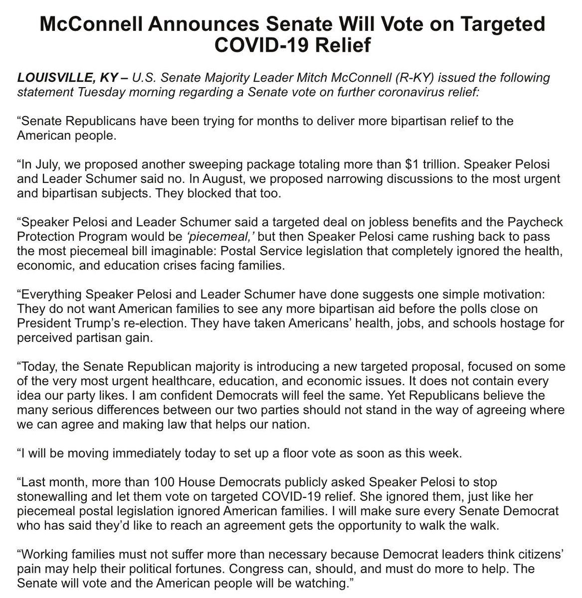 McConnell on COVID-19 relief: "Today, the Senate Republican majority is introducing a new targeted proposal, focused on some of the very most urgent healthcare, education, and economic issues..I will be moving immediately today to set up a floor vote as soon as this week."