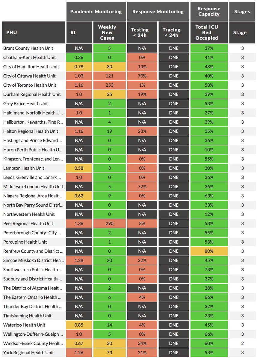 (#COVID19 pandemic/response monitoring, response capacity, and stage by PHU) from @howsmyflattenON