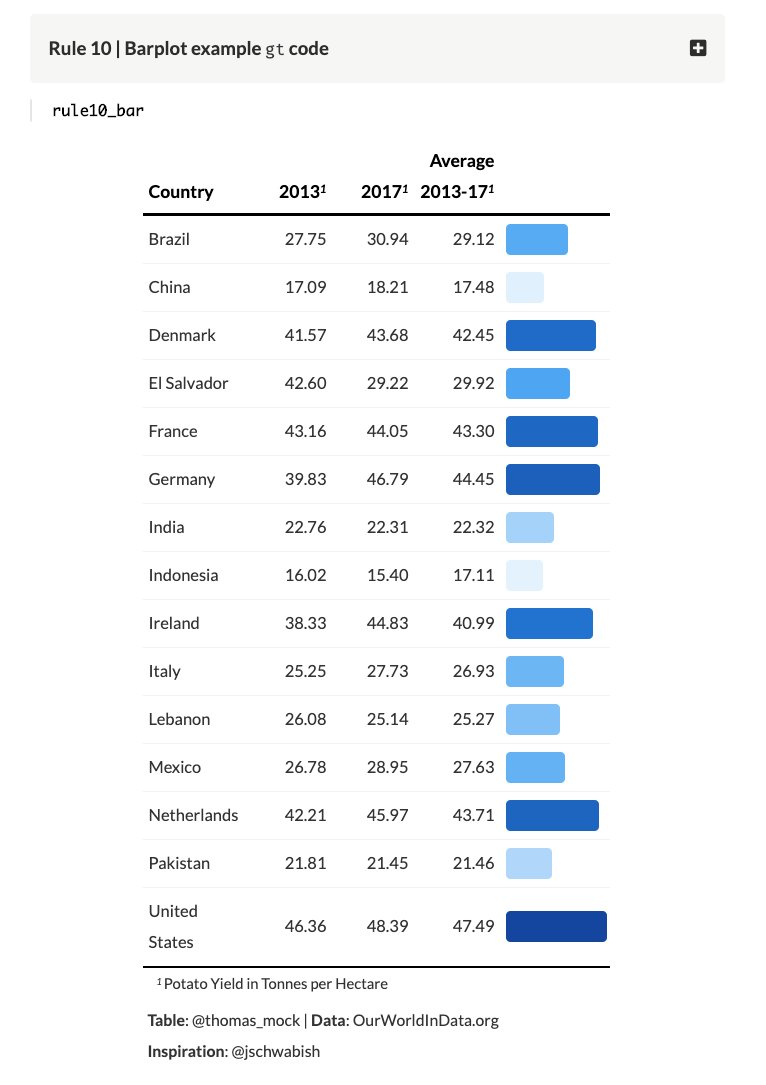 @jschwabish put together his "10 Guidelines for tables", which I've adapted to {gt} + #rstats with "good" and "bad" examples.