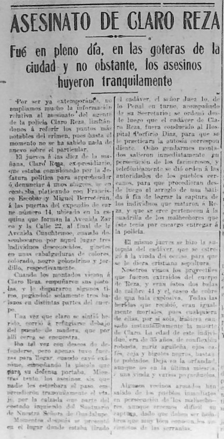 Emeterio Medina relata: “[…] el llamado Pancho Villa, quien frente a dicha carnicería y estando en su interior sentado Claro Reza […] llegó Villa con la pistola en la mano y se la vació a Claro, quien salió bamboleándose con dirección al arroyo de Guadalupe y se dejó caer [5]👇