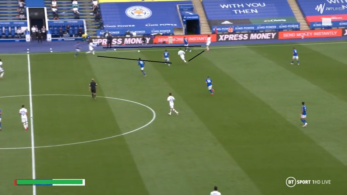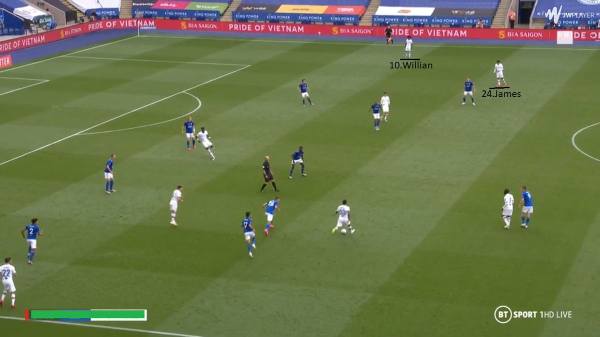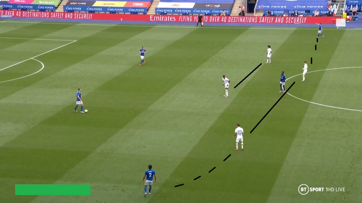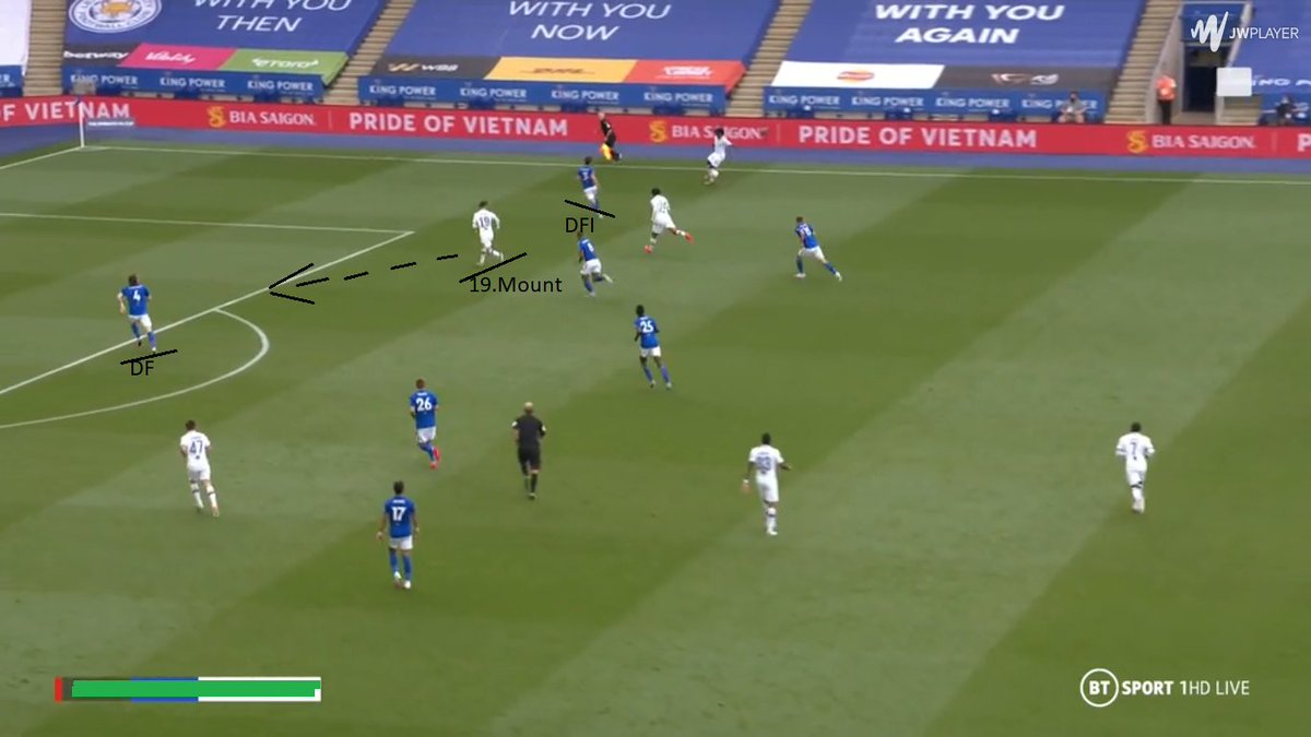 La idea de Lampard consiste en que ni Ndidi ni Tielemans reciban la pelota cómodamente, es por eso que utiliza tanto a Kante como a Mount como sus perseguidores. Durante el transcurso del partido se puede ver como siempre tienen alguien encima para incomodar