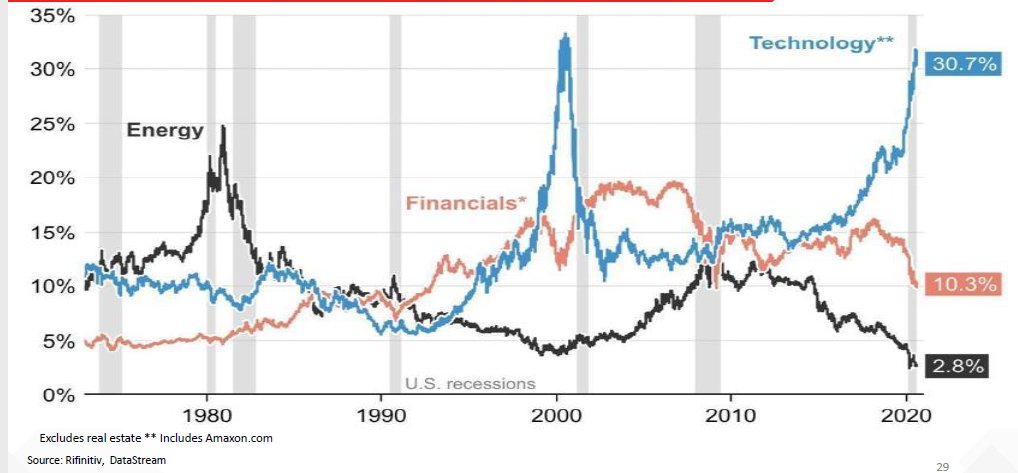 Tech stocks have been the driver of the market rally, with Tech now comprising over 30% weight in Markets. The chart shows how different sectors behaved for last many years.