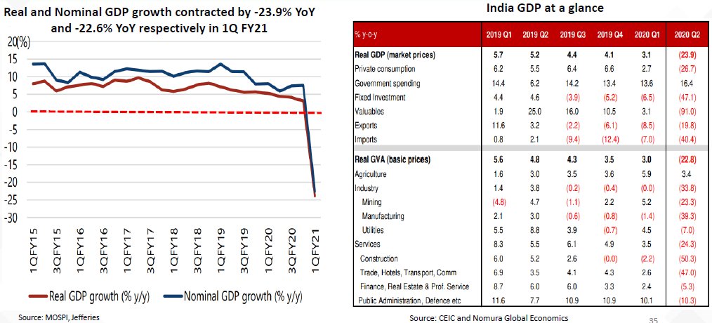 We have already seen in the news pages that India's #GDP growth has contracted by -23.9%. The contraction is across all sectors in India as can be seen in the table to the right.