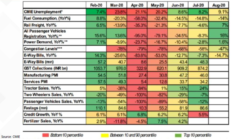 Compared to the initial months of lockdown, Economic Indictators for July & August 2020 are looking better. This would point to gradual recovery with each passing month owing to lifting of lockdown in a stage by stage manner.