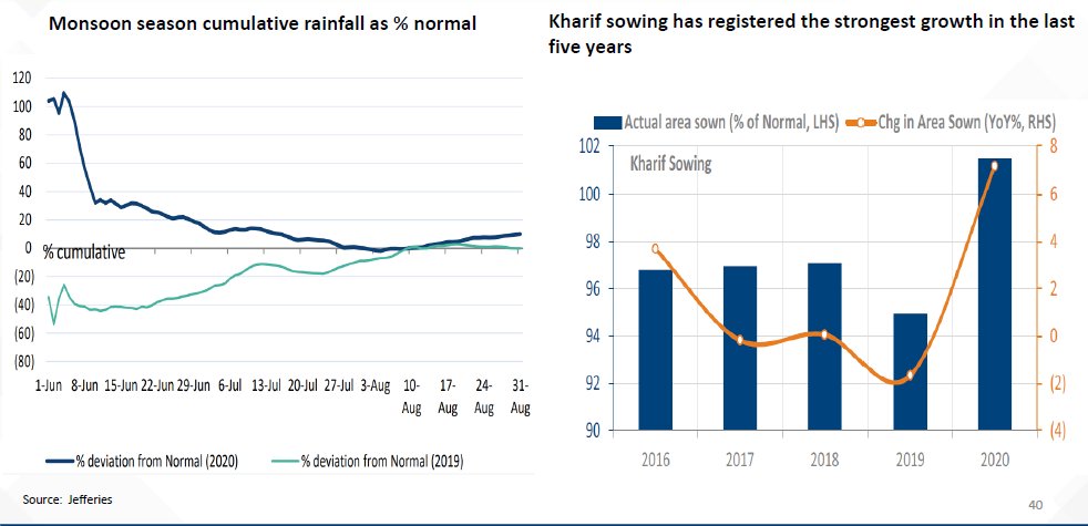 Monsoon in 2020 (Dark blue) vs 2019. Clearly good rains across the board in India. This is also reflected in very encouraging Kharif sowing.