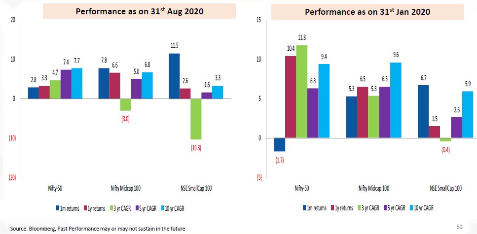 The driver of the returns are primarily driven from Pharma sector which has been in limelight in 2020, followed by IT. FMCG has been relatively flat. Worse hit hv been Banking, Financials & Reality. A sector to watch out is Auto - which forms a major part of manufacturing