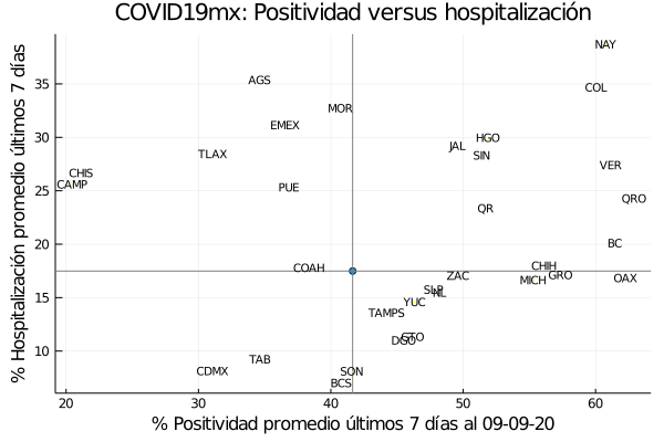 #Positividad (resultados positivos como % del total de resultados confirmados) versus #hospitalización (nuevas hospitalizaciones como % de los nuevos casos), #promedio últimos 7 días, todas las entidades federativas de #México (el punto azul es el promedio nacional).