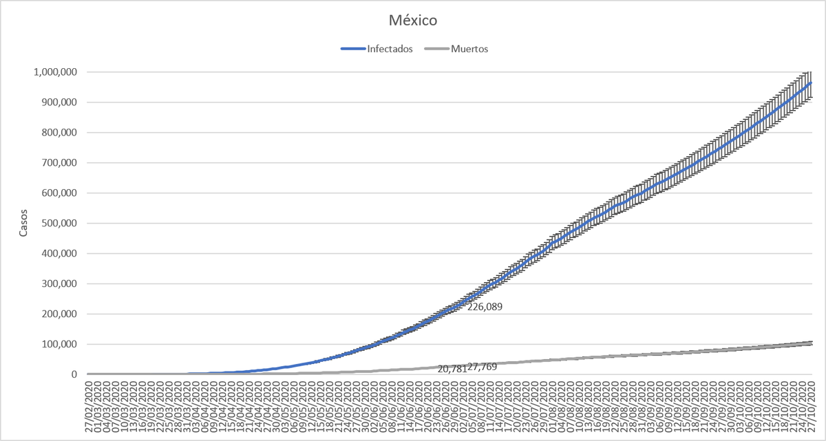 Para México teníamos una proyección de 648,301 casos y 69,044 decesos. La @SSalud_mx reporta 647,507 casos y 69,095 defunciones. La proyección para mañana es de 652,905 casos y 69,665 decesos.