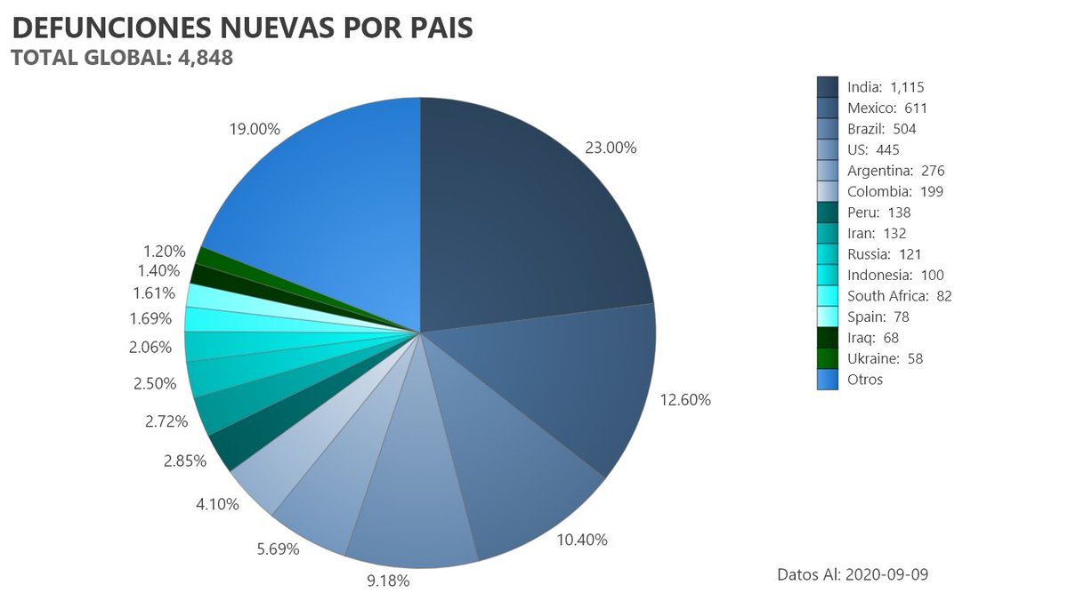 En defunciones nuevas México está en segundo lugar de la métrica y contribuye con el 12.6% del total de muertos mundial para el día de hoy.