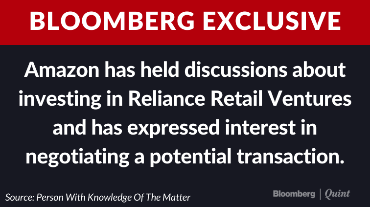 RIL is offering to sell up to 40% stake in its retail business to Amazon, reports Bloomberg.