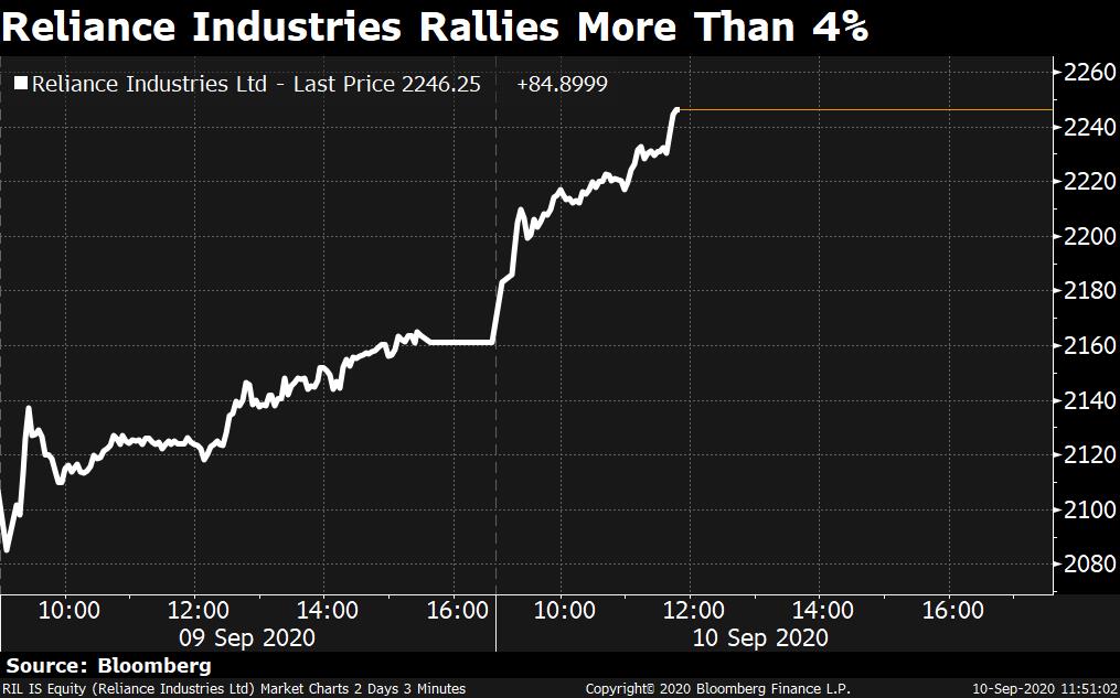 #Reliance Industries extends gains to 4% after Bloomberg reports company may sell stake in retail unit to Amazon.
