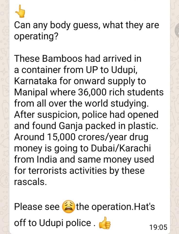 15,000 crores worth of drugs found packed inside stacks of bamboo in a truck. Udupi Police stopped this truck on its way to Manipal.