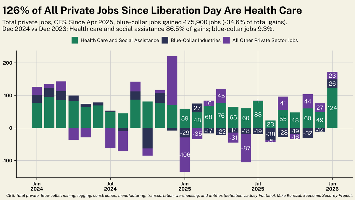 As par for the course, 95% of those total job gains in January are from health care and social assistance. That's about 124% of private sector job growth since liberation day.
