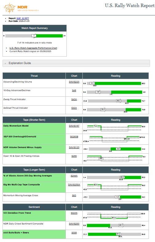 Big Mo Tape is one of the indicators in our Rally Watch Report. It's back to 7/14 bullish signals. The fact that the short-term breadth thrust indicators haven't fired isn't surprising. 3/4 short-term tape + 2/3 long-term tape says the trend is bullish. That 2/3 sentiment are still bullish implies not everyone is all in yet. 2/4
