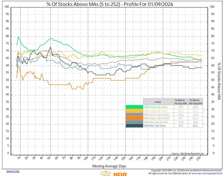 Style breadth is strong. All 6 style boxes have >60% of stocks above their 200-day moving averages. Weaker short-term breadth from large-cap Growth bears watching.