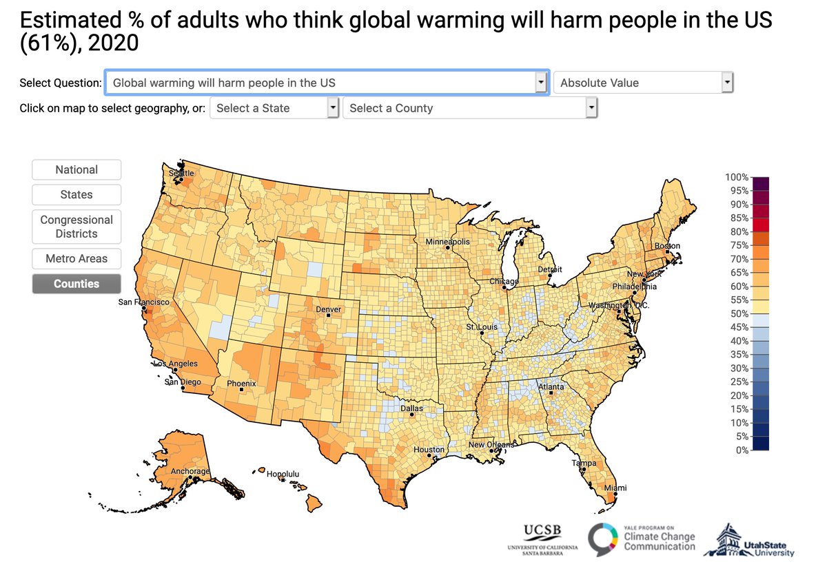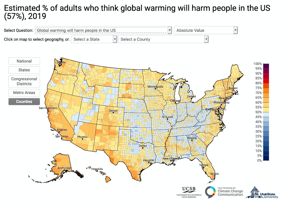 2. Will global warming harm people in the US? People who say "yes" are now 61% versus 57% in 2019, and scales are now weighted in the direction of yes (orange colours) across most of the US including the previously doubtful centre of the country. Alright {sigh} centER.