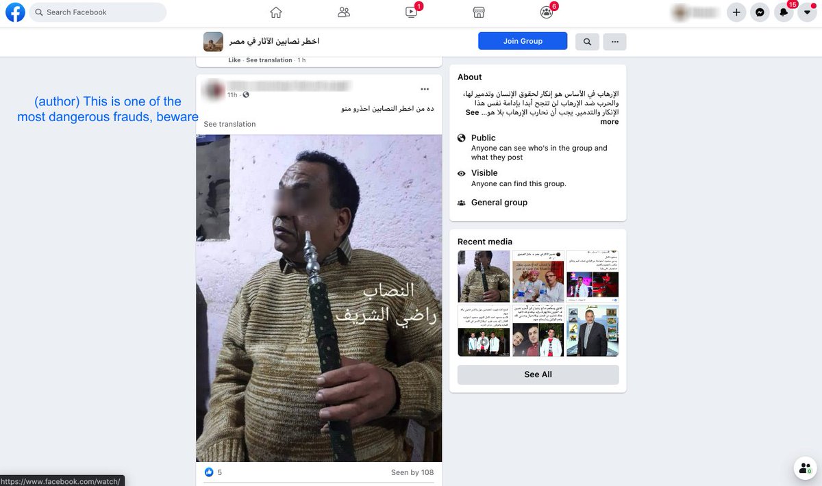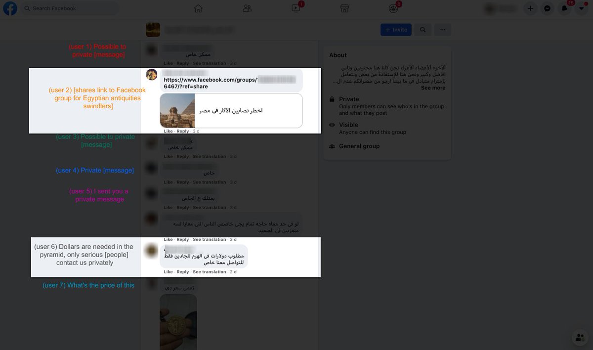 User 2 shares a Facebook group for "The most dangerous antiquities swindlers in Egypt"—he also happens to be the group admin.