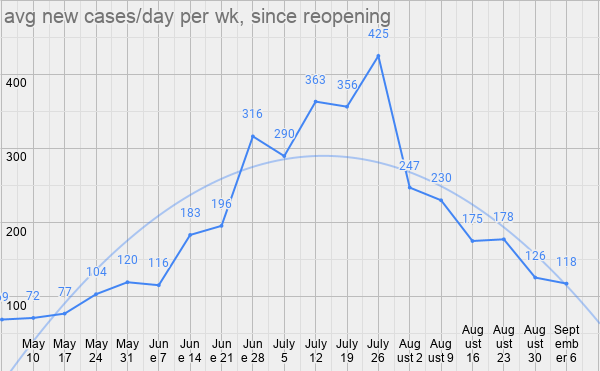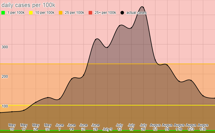 We hit a peak of 45.3 avg daily cases per 100k the week of July26.