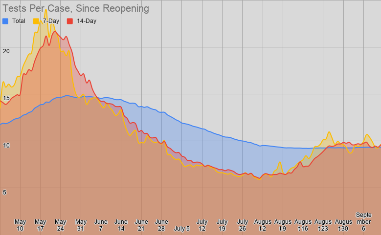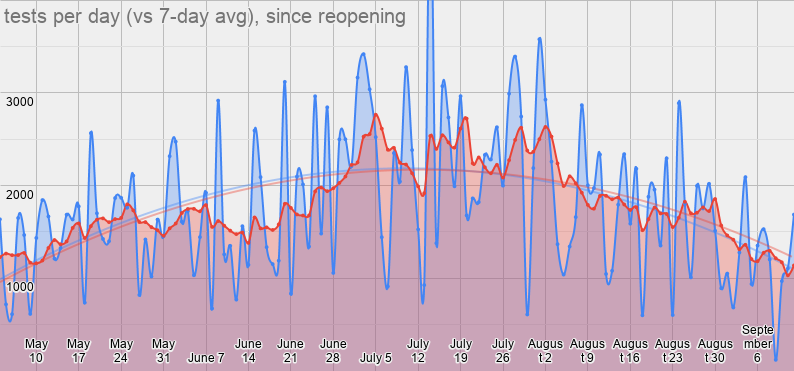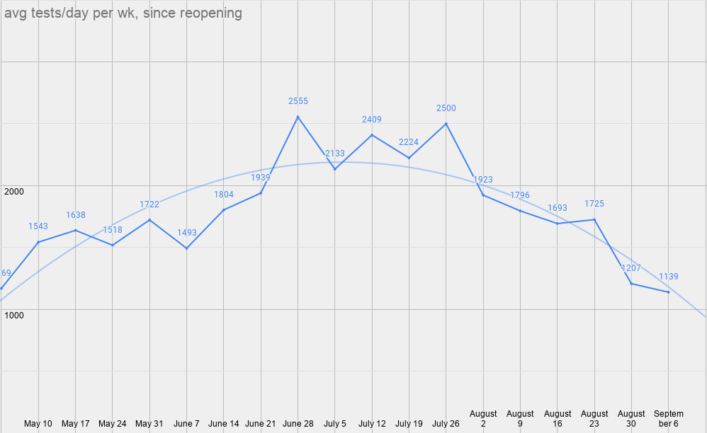 At 1139 tests/day this week, we're at our lowest testing output since before we reopened the first week of May.